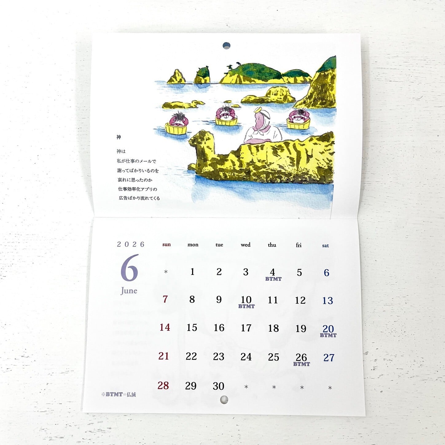 ■イラストレーター「死後くん」カレンダー 2026がやってきました。シュールで痛快愉快な世界観と12ヵ月付き合ってください。今回もBTMT(仏滅)が一目瞭然仕様。