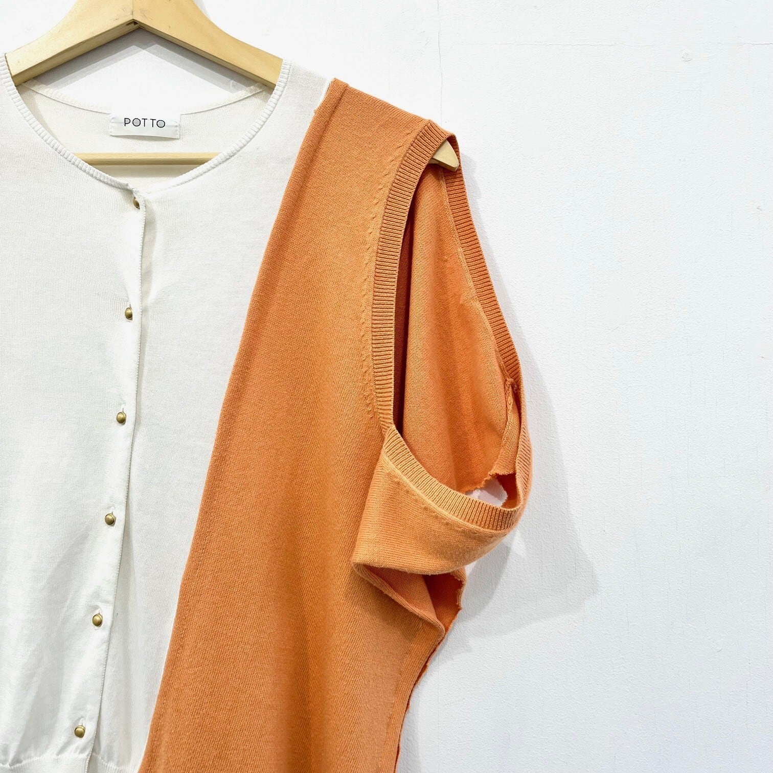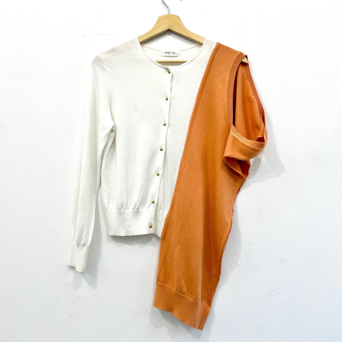 ■カーディガンとベストを足した、ユーモアと前衛が混じったPOTTOらしいデザインです。