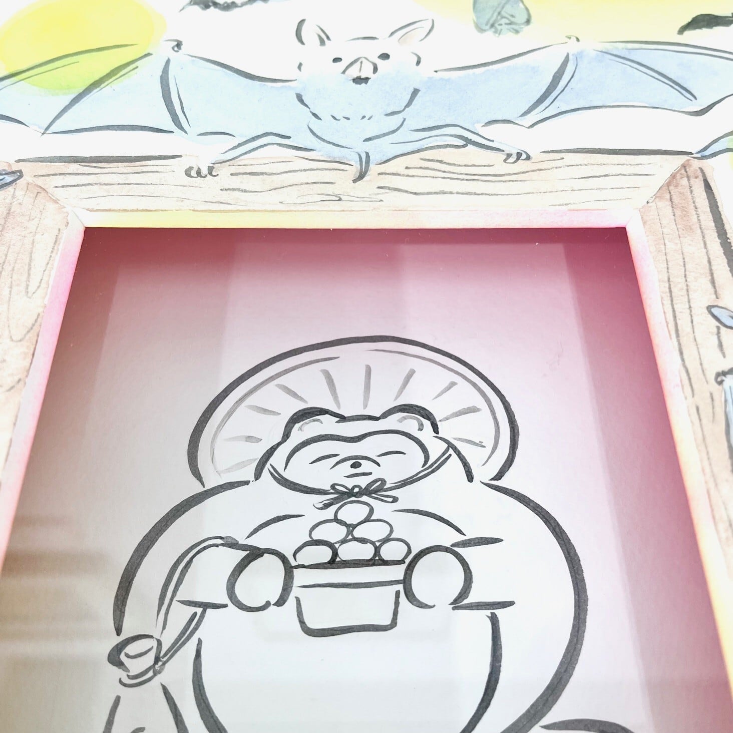 ■ 手前ガラス面に台紙(囲炉裏)があり、奥の面におだんごたぬきが描かれている二重絵になります。