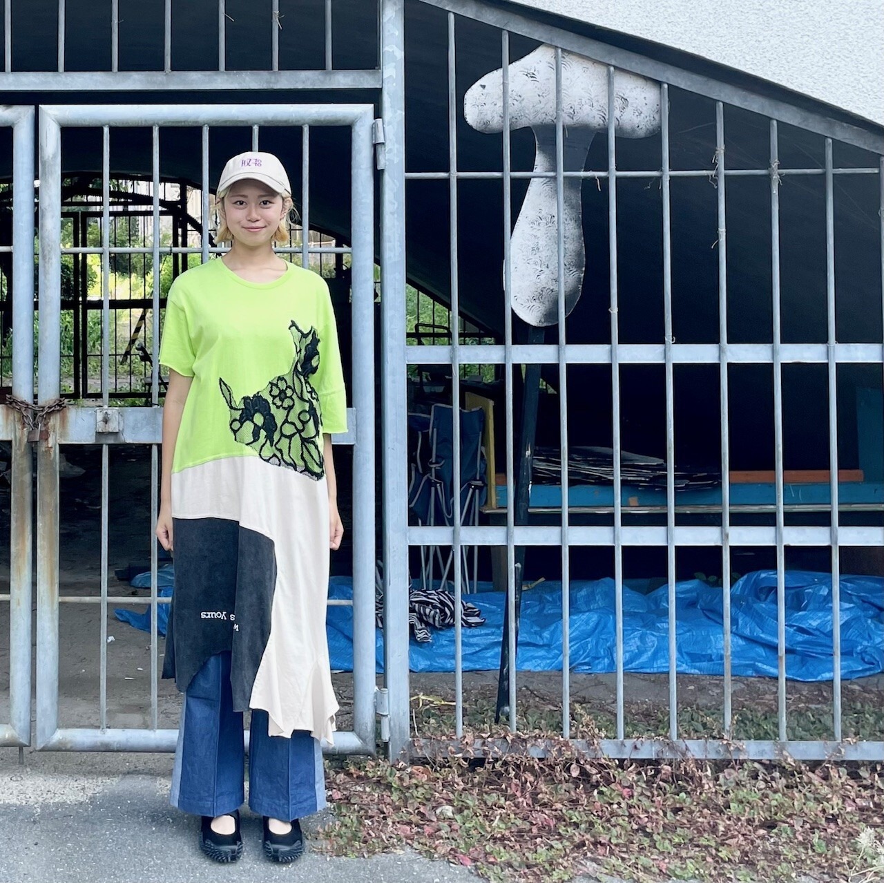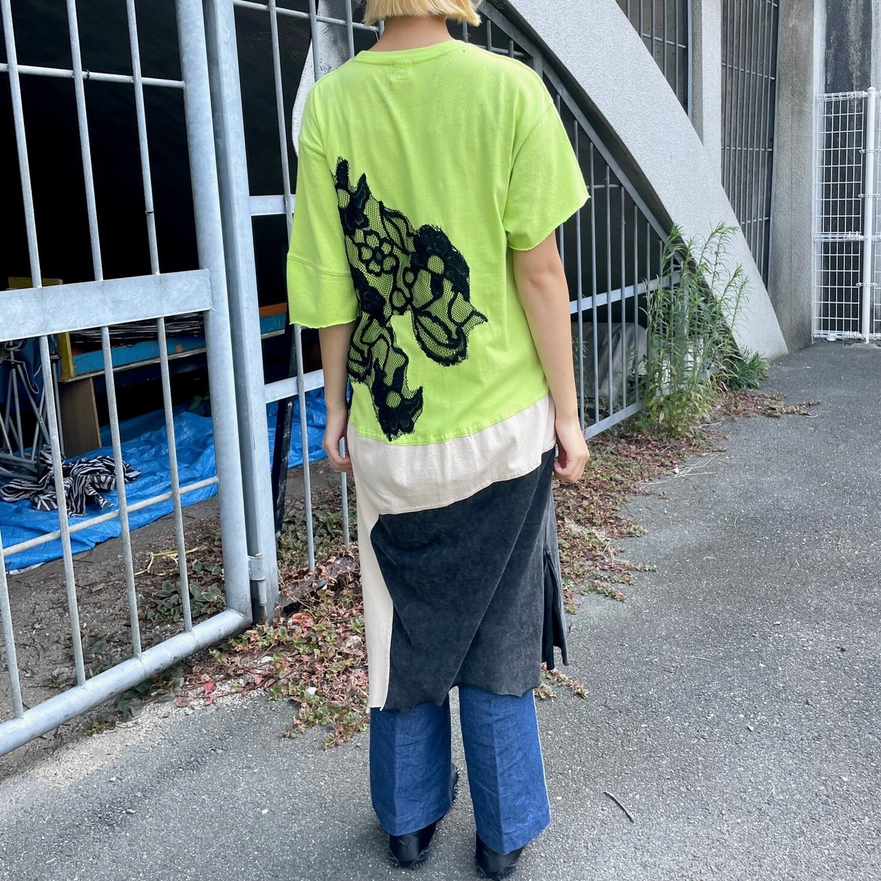 ■こちらは3つのTシャツをドッキングさせたワンピースになります。黒い部分のみ、ギャルブランドの古着Tシャツを使用。"world is yours"という強気なメッセージが入っています。レース生地をアップリケし、袖はアシメトリーになっています。背中側に薄くペイントが入っています。